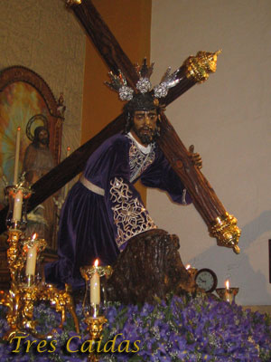 La imagen de Jesús de las Penas inicia el camino después de la tercera, ayudado por el Cirineo, y fustigado por un soldado romano, la Verónica porta un lienzo, obra de NHD. Jesús García Osorno), con el que enjuga la cara del Señor. Pese a que se representa en este misterio la Tercera Caída de Jesús en el camino hacia el Gólgota, por la postura de su cuerpo se puede apreciar que en realidad el nazareno comienza ya su inicio tras la caída; se encuentra apoyada en el suelo con su mano y rodilla derecha, y ambos pies. Con su brazo izquierdo agarra el crucero, de estilo arbóreo tallado por Francisco Márquez, que en 1997 sustituye al anterior.