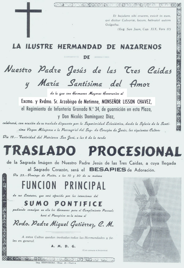 3.-Otro de los documentos existentes es la convocatoria del traslado de nuestro titular al Sagrado Corazón de Jesús, el 19 de marzo de 1947, festividad de San José. En ella se puede leer: "La Ilustre Hermandad de Nazarenos de Nuestro Padre Jesús de las Tres Caídas y María Santísima del Amor de la que son Hermanos Mayores Honorarios el Excmo. Rvdmo. Sr. Arzobispo de Metimne, MONSEÑOR LISSÓN CHÁVEZ, el Regimiento [...]"