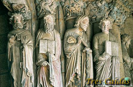 Todo este Pórtico esta soportado por columnas en las que aparecen en su base animales monstruosos que significan el paganismo sobre el que se alzan los Apóstoles de su Iglesia, que soportan este Pórtico con unas actitudes alegres de bastante movimiento. Las diversas figuras conservan aún parte de su policromía original restaurada en el siglo XVI.