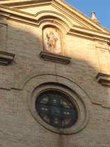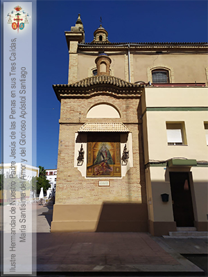 El campanario tiene en su interior tres campanas, llamadas San Sebastián, La Cinta y Sagrado Corazón de Jesús. Su fachada y campanario son de ladrillo con distintos relieves en su fachada principal, además de varios azulejos artísticos que la adornan, en 2019 se instaló un retablo cerámico con motivo del 75 aniversario fundacional de nuestra hermandad obra de Ángel Lora. Sobre el dintel de la puerta principal podemos observar un azulejo, con forma de semicírculo que representa la "Adoración de los Reyes Magos", y sobre este en una hornacina, otro azulejo con la imagen del Corazón de Jesús.