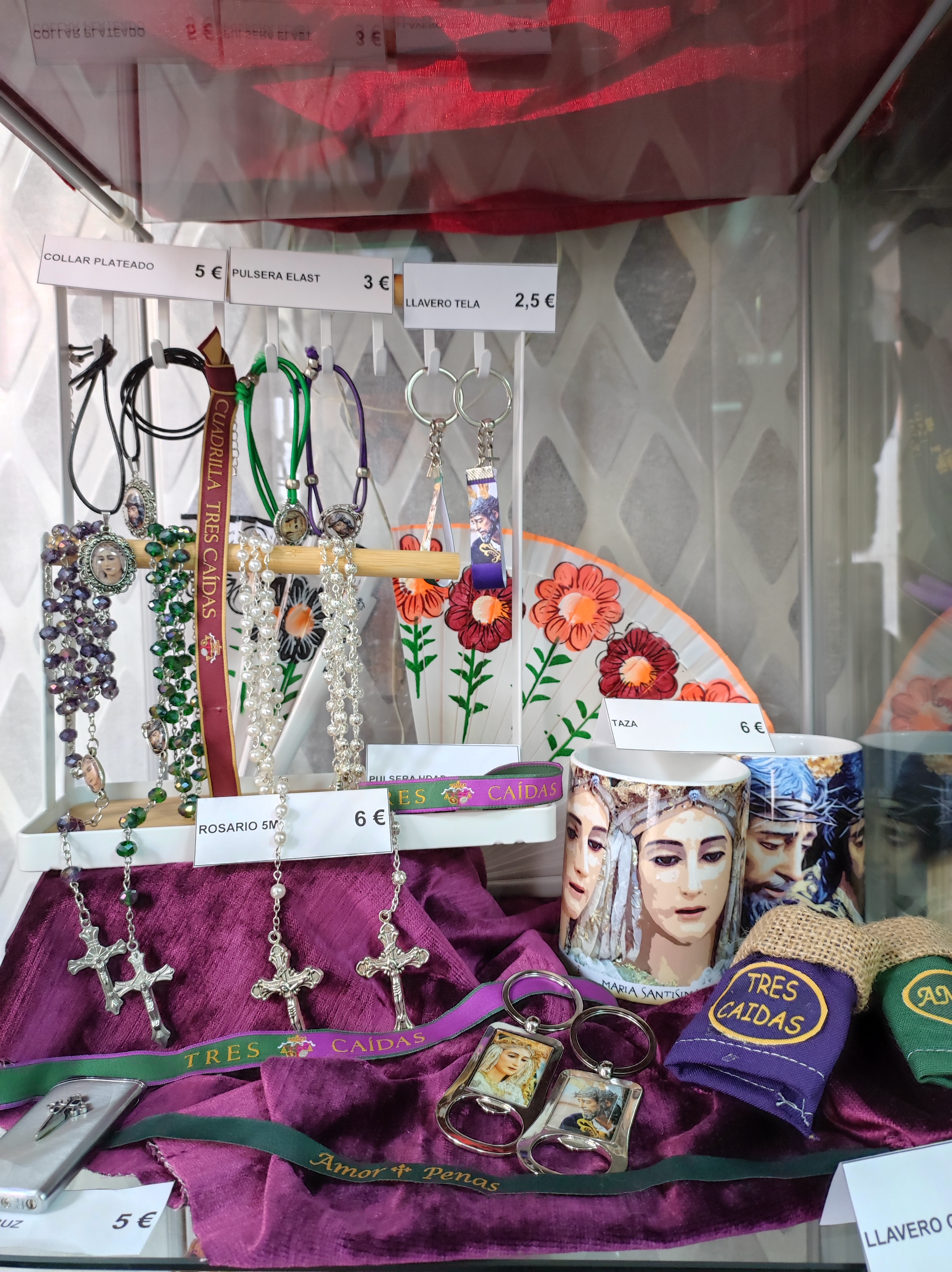 La hermandad dispone de un amplio catálogo de artículos de venta en el expositor de la Casa de Hermandad que se van renovando y actualizando. Te invitamos a pasarte por allí y adquirir algunos de los elementos que tenemos a la venta.
